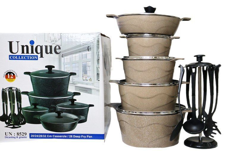 سرویس 17 پارچه چدن یونیک حک شده داخل و بیرون گرانیتی سایز قابلمه 20,24,28,32 سایز تابه بادرب 28 7عدد کفگیر و ملاقه به همراه پایه کیفیت بسیار عالی